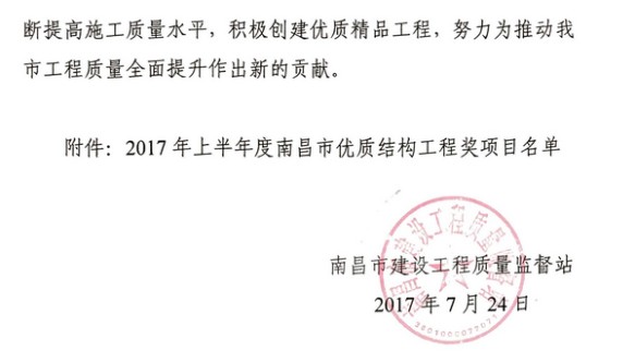 本報訊 由我公司承建的南昌市瑤湖郊野森林公園游客服務中心項目,在2017年度榮獲結構優良工程獎項。此次獲得的榮譽離不開中寧全體人員的共同努力,中寧在未來的發展中,也將秉承著“專業、優質”,不斷前行!