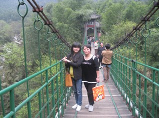 在行進的路上,我們共同看到了六龜拜月的祈福景象,在烏龜賽跑精神的世界里,似乎預寓著我們勝利的凱旋。風景秀美的明月山,在我們一步一步的接觸下,更佳體現出了她宏偉的身軀。這不是晃月橋嗎?只聽見有人驚呼。在平坦的兩山間,居然有這么一座跨度如此大的索鏈橋,真可謂是,友情相約一線牽,好似牛郎與織女的紅線。