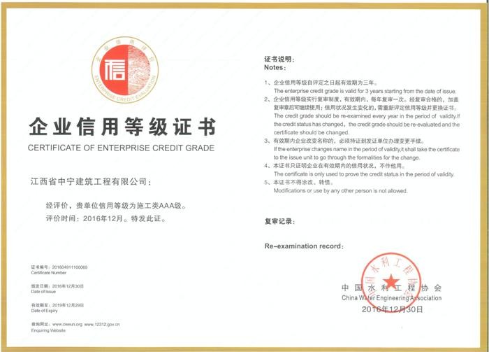 熱烈慶祝我司榮獲水利3A信用等級證書